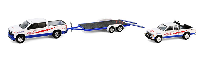 Voiture sous blister de la série HITCH & TOW – AMERICAN THUNDER -CHEVROLET Silverado 1500 2023 avec porte voiture et CHEVROLET S-10 Baja